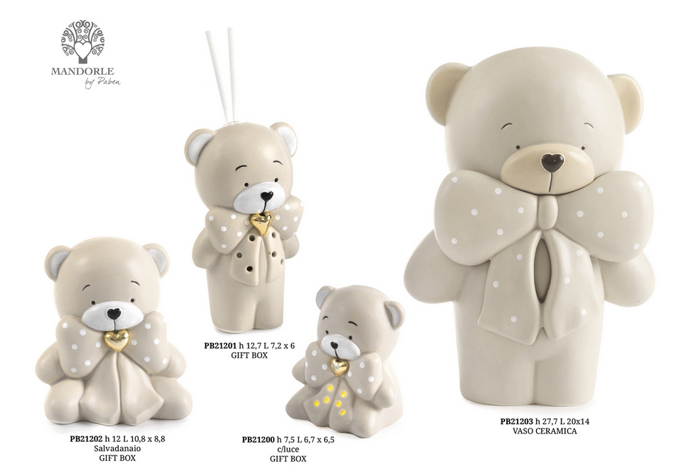 Bomboniere Solidali - Orsetto seduto con fiocco avana con luce completo di scatola regalo