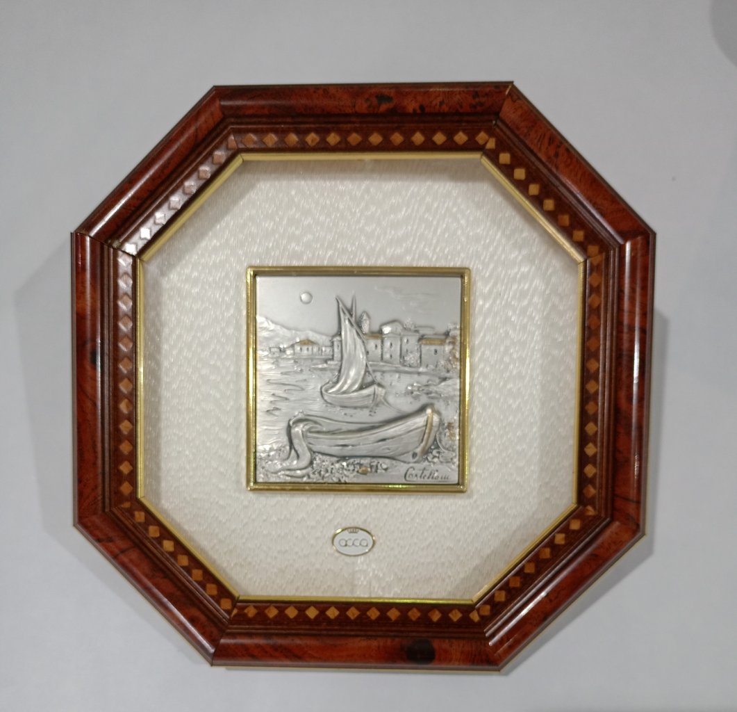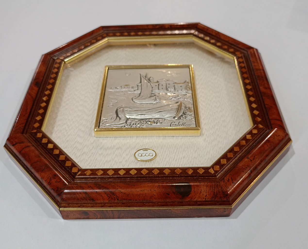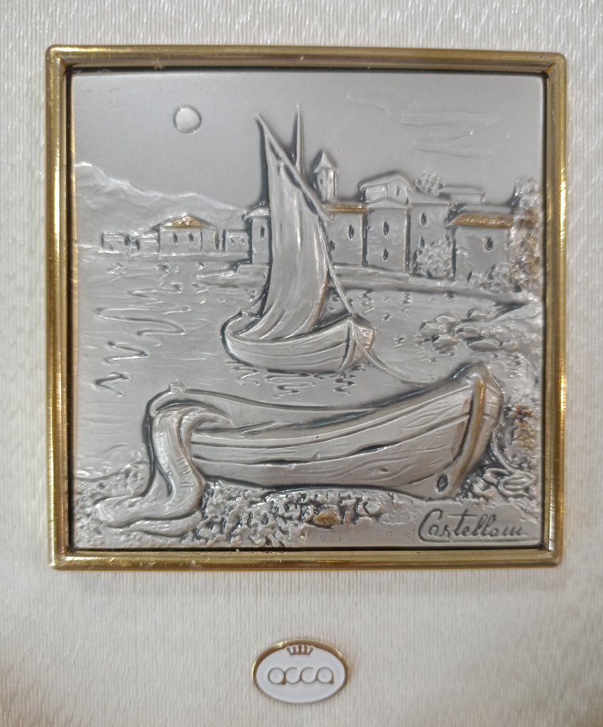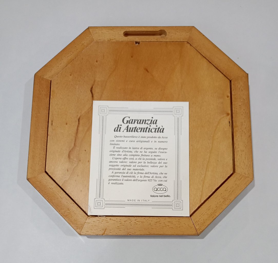 E' realizzato su lastra in argento, su disegno originale d' Artista che ne ha
